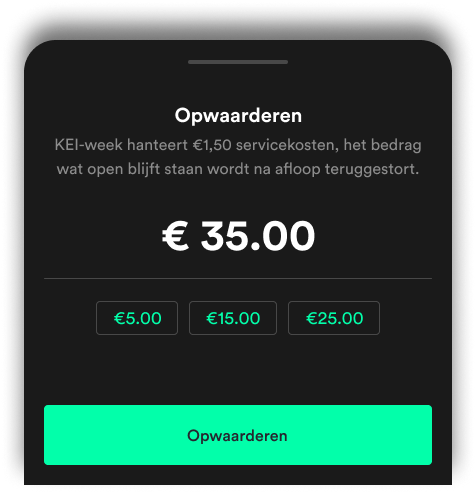 Via de app is het ook mogelijk om het actuele saldo van je bandje in te zien en saldo op dit bandje te zetten. Hiermee wordt betaald op de gehele KEI-week.