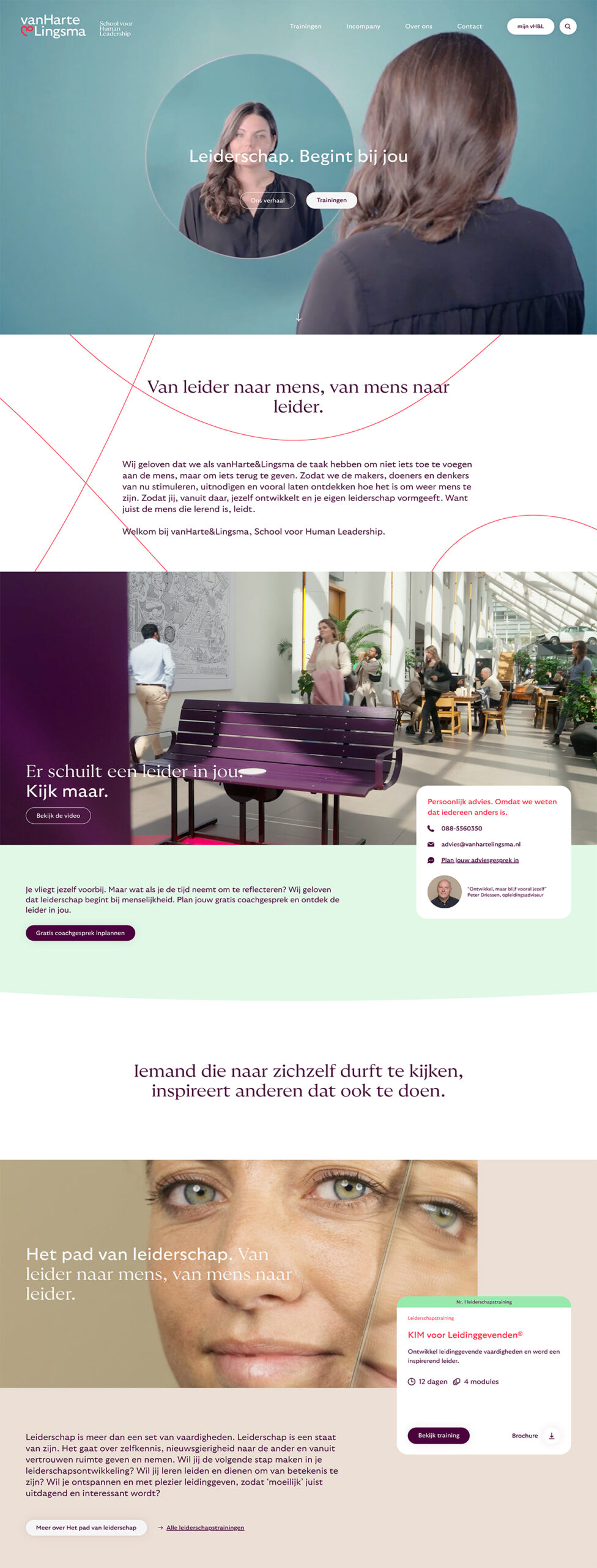 Van Harte & Lingsma is een toonaangevend Nederlands opleidingsinstituut dat organisaties en individuen begeleidt in hun persoonlijke en professionele ontwikkeling. Al meer dan 40 jaar biedt het bedrijf trainingen en programma’s gericht op leiderschapsontwikkeling, communicatie en persoonlijke groei. De vorige website voldeed niet meer aan de behoeften van de huidige digitale tijd en paste niet meer bij de waarden en uitstraling van Van Harte & Lingsma. Tijd voor een vernieuwde, toekomstbestendige website die hun unieke missie en aanbod weerspiegelt.