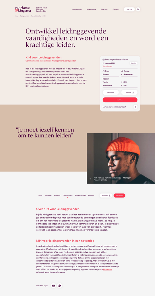 De nieuwe website moest bezoekers niet alleen overzichtelijk door het aanbod leiden, maar hen ook laten ervaren wat vanHarte&Lingsma uniek maakt. Het doel was om elke bezoeker, of deze nu op zoek is naar leiderschapstrainingen, persoonlijke ontwikkelingstrajecten of bedrijfsprogramma’s, op een intuïtieve manier naar de juiste informatie te begeleiden. Met een heldere structuur, krachtige visuals en toegankelijke taal geven we de bezoeker inzicht in het uitgebreide aanbod, waarbij we rekening houden met de verschillende behoeften van nieuwe en terugkerende klanten.